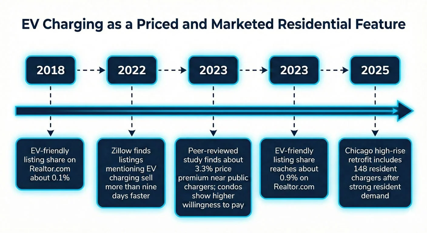 The following timeline synthesizes the adoption of EV charging as a marketed residential feature, using national listing evidence and a Chicago retrofit example.¹ ² ³ ⁹ [12]