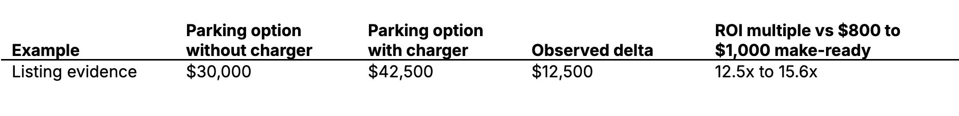 One Chicago listing explicitly priced an EV-equipped stall above a standard stall: $42,500 for a garage space with a new EV charger versus $30,000 for a comparable garage space, implying a $12,500 delta.⁴ [4] This is not a controlled study and reflects an asking structure rather than a verified sale premium, but it is a direct example of how EV charging can be monetized as a discrete parking asset.