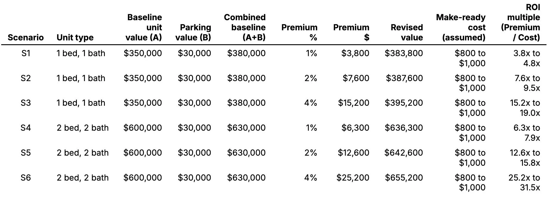 Interpretation: under the primary conservative assumption of a 2% premium, the implied value uplift is approximately $7,600 for a 1 bedroom and $12,600 for a 2 bedroom, compared to an assumed $800 to $1,000 make-ready cost per space. The implied payback multiple is therefore approximately 7.6x to 15.8x, depending on unit type and the assumed cost within the $800 to $1,000 range.